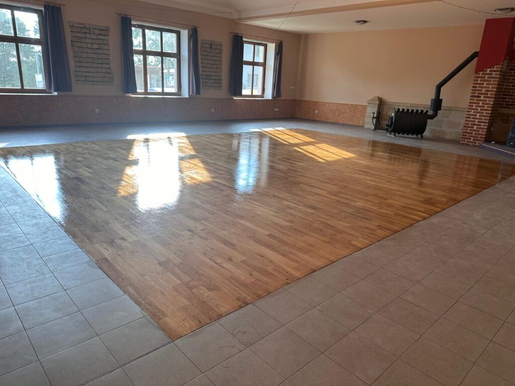 V obecním sále ve Smrkovicích jsme realizovali kompletní rekonstrukci podlahových krytin. Projekt zahrnoval pokládku dřevěné podlahy v hlavní části sálu s důrazem na precizní provedení a odolný povrch, který vydrží intenzivní využívání při kulturních a společenských akcích.