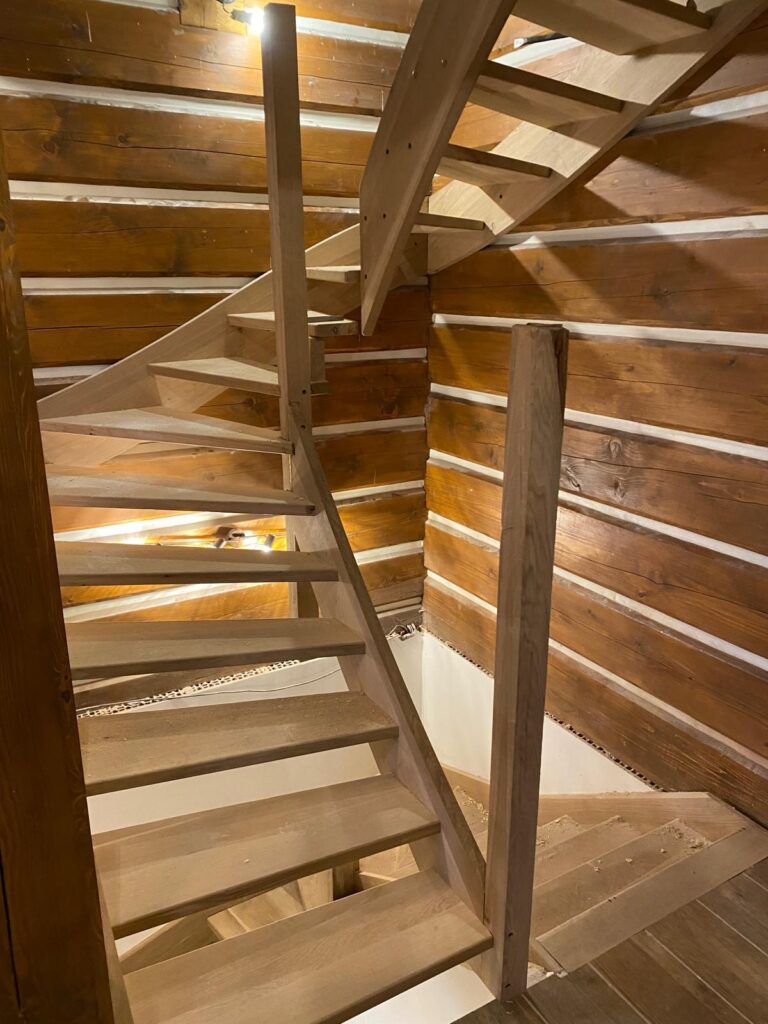 Projekt zahrnoval kompletní výrobu a montáž dřevěného schodiště v roubené chatě. Úkolem bylo vytvořit schody, které respektují tradiční styl objektu a zároveň splňují moderní nároky na bezpečnost a pohodlí.